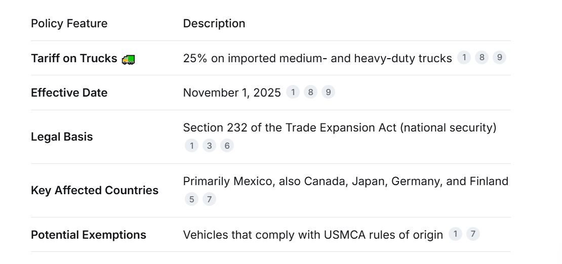 1. নীতির যুক্তি: এই শুল্কটি এপ্রিল 2025 সালে শুরু হওয়া একটি ধারা 232 তদন্তের উপর ভিত্তি করে তৈরি করা হয়েছে, যা এই সিদ্ধান্তে পৌঁছেছে যে আমদানি করা ট্রাকের উপর নির্ভরতা মার্কিন জাতীয় নিরাপত্তা এবং অভ্যন্তরীণ লজিস্টিক চেইনকে হুমকির সম্মুখীন করে৷ লক্ষ্য হল আমেরিকান নির্মাতারা এবং চাকরি রক্ষা করা।